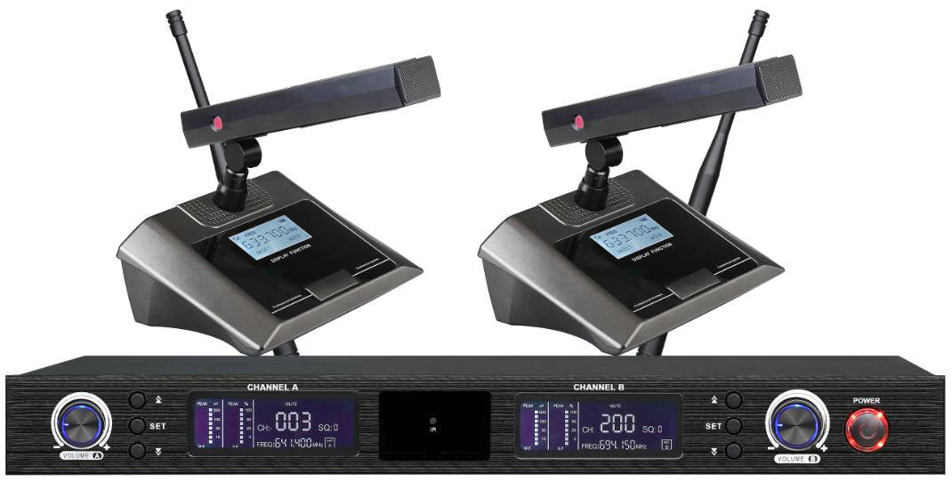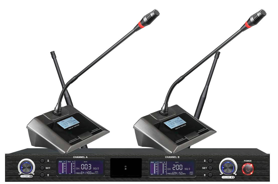 10、同一會場可五套主機同時使用,領(lǐng)夾話筒、手持話筒、會議話筒混合搭配使用,通用性強。